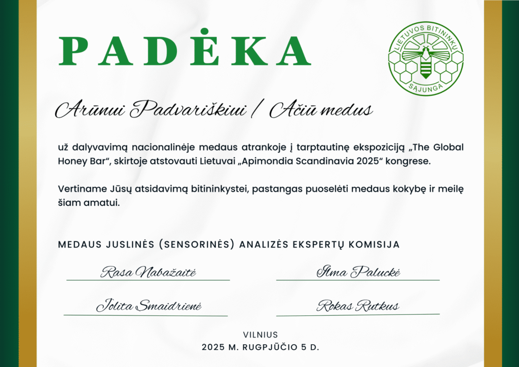 Mums svarbu dalintis tuo, ką darome nuoširdžiai ir atsakingai. Džiaugiamės, kad mūsų pastangos buvo įvertintos – gavome padėką už dalyvavimą nacionalinėje medaus atrankoje į tarptautinę ekspoziciją „The Global Honey Bar“, skirtą atstovauti Lietuvai „Apimondia Scandinavia 2025“ kongrese.